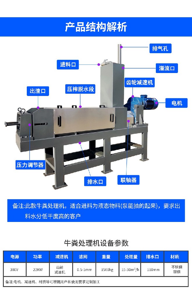 選擇合適的螺旋壓榨機需要綜合考慮多方面因素,以下是針對不同物料(牛糞、餐廚垃圾、白菜脫水、果蔬垃圾)脫水處理來分析如何選擇螺旋壓榨機的相關要點:牛糞脫水處理物料特性:牛糞通常含有較多的纖維成分,質(zhì)地相對較稠,濕度含量因來源和處理階段不同有所差異,但一般含有一定水分需要去除以便后續(xù)處理,比如制作有機肥
