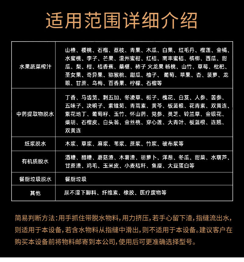 由于待脫水物料種類繁多,不同物料的含水率、分子水比例、粘度、纖維含量、吸水性、韌性、有機(jī)物或無(wú)機(jī)物等等數(shù)據(jù)各有不同,我公司工程師會(huì)根據(jù)每一位客戶提供的待脫水的物料進(jìn)行分析,計(jì)算出適用于該物料的參數(shù),制作出適合的設(shè)備,將物理壓榨作用利用到**,降低擠出物料含水率。