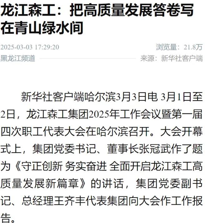 2025年及今后一個(gè)時(shí)期,龍江森工集團(tuán)將堅(jiān)定不移朝著“五年大發(fā)展”的目標(biāo)奮勇向前,全面深化改革開放,深入推進(jìn)生態(tài)治理體系和治理能力現(xiàn)代化,努力把自身打造成擁有一支讓黨和人民信得過、靠得住、能放心的生態(tài)鐵軍隊(duì)伍的一流國企,全面開啟龍江森工發(fā)展的嶄新篇章。